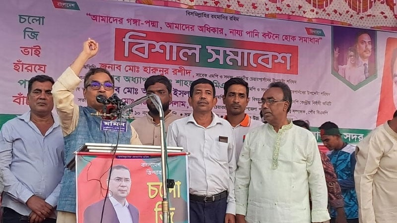 হারুনুর রশিদ আরও বলেন, বিএনপির প্রতিষ্ঠাতা সাবেক রাষ্ট্রপতি জিয়াউর রহমান পানি সংকট নিরসনের জন্য গঙ্গা ব্যারাজ নির্মাণে প্রকল্প নিয়েছিলেন। ২০০৫ সালে খালেদা জিয়ার আন্তরিক প্রচেষ্টায় একনেক থেকে গঙ্গা ব্যারাজ প্রকল্প অনুমোদন হয়। ৫ হাজার কোটি টাকা ব্যয়ের এই প্রকল্পের সমীক্ষাও জমা হয়েছিল। কিন্তু শেখ হাসিনার সরকারের ভারতপ্রীতির কারণে সেই সমীক্ষাটি চলে গেছে ডিপ ফ্রিজে। বিএনপি ক্ষমতায় গেলে সব স্বপ্ন বাস্তবায়ন করা হবে। নির্বাচিত হলে জেলা শহরের জলাবদ্ধতা নিরসনের জন্য ডিজিটাল সার্ভের মাধ্যমে ড্রেনেজ ব্যবস্থার উন্নয়ন করার ঘোষণা দেন তিনি।
