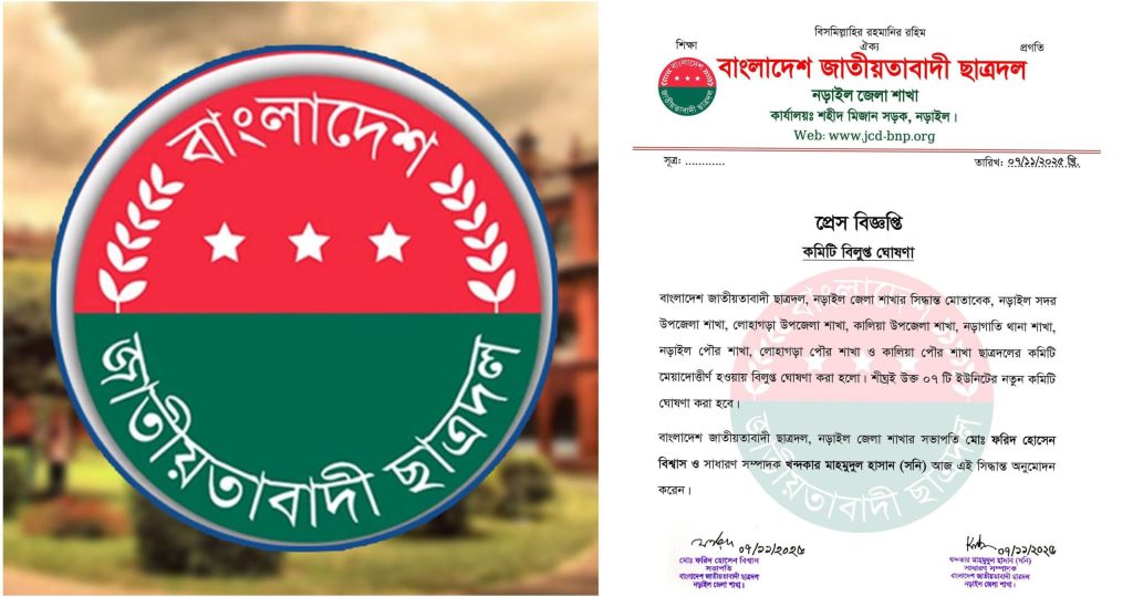 প্রেস বিজ্ঞপ্তিতে জানানো হয়, বাংলাদেশ জাতীয়তাবাদী ছাত্রদল নড়াইল জেলা শাখার সিদ্ধান্ত মোতাবেক, নড়াইল সদর উপজেলা শাখা, লোহাগড়া উপজেলা শাখা, কালিয়া উপজেলা শাখা, নড়াগাতী থানা শাখা, নড়াইল পৌর শাখা, লোহাগড়া পৌর শাখা ও কালিয়া পৌর শাখা ছাত্রদলের কমিটি মেয়াদোত্তীর্ণ হওয়ায় বিলুপ্ত ঘোষণা করা হলো। শীগ্রই উক্ত ৭ ইউনিটের নতুন কমিটি ঘোষণা করা হবে।