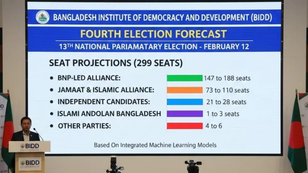 বিআইডিডি জানিয়েছে, পূর্বাভাস তৈরিতে প্রচলিত জনমত জরিপের পাশাপাশি একটি আধুনিক গবেষণাপদ্ধতি ব্যবহার করা হয়েছে। এতে ১৯৯১ থেকে ২০০৮ সালের জাতীয় নির্বাচনের তথ্য বিশ্লেষণ করে ভোটার উপস্থিতি ও দলভিত্তিক ভোটের ধারা নিরূপণ করা হয়। পাশাপাশি ২০২৪ সালের আগস্টের পর বিভিন্ন গবেষণা প্রতিষ্ঠানের জরিপের তথ্য যুক্ত করে মেশিন লার্নিং মডেলের মাধ্যমে সম্ভাব্য ফলাফল বিশ্লেষণ করা হয়েছে।