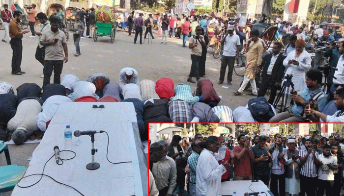 গণ সেজদার পর মোনাজাতে ‘মঞ্চ ২৪’ এর আহ্বায়ক ফাহিম ফারুকী বলেন, “আল্লাহ আরশের মালিক, রহমতের ছোঁয়ায় আমাদের বাংলাদেশকে তুমি রক্ষা করো।