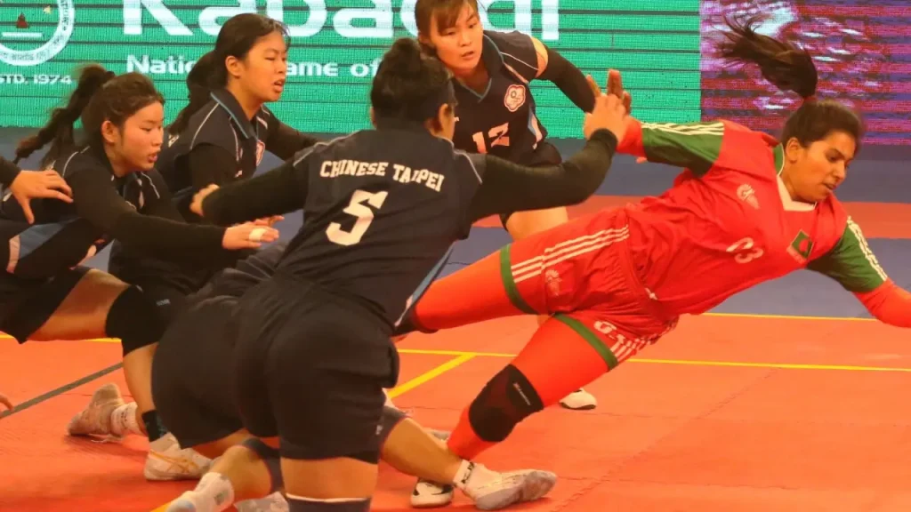 ২০১২ সালের নারী কাবাডি বিশ্বকাপের প্রথম আসরে গ্রুপ পর্ব থেকে বিদায় নেওয়া চাইনিজ তাইপে এবারের আসরে শুরু থেকেই আধিপত্য বিস্তার করছে। ‘বি’ গ্রুপের চ্যাম্পিয়ন হয়ে সেমিফাইনালে উঠে আসা দলটি বাংলাদেশের বিপক্ষে প্রথমার্ধ শেষ করে ৯-৮ পয়েন্টে এগিয়ে থেকে। ব্যবধান আরও বাড়তে পারত, বিরতির বাঁশি বাজার আগ মুহূর্তে সুপার ট্যাকলে ২ পয়েন্ট তুলে বাংলাদেশ ব্যবধান কমিয়ে প্রথমার্ধ শেষ করে। দ্বিতীয়ার্ধের শুরুতে ব্যবধান ঘুঁচিয়ে ১০-৮ পয়েন্টে এগিয়ে যায় বাংলাদেশ। চাইনিজ তাইপেও পাল্টা আঘাতে ১০-১০ সমতায় ফিরে। সময় গড়ানোর সাথে সাথে আধিপত্য বাড়তে থাকে চাইনিজ তাইপের। এ অর্ধের পঞ্চম মিনিটে বাংলাদেশকে অল আউট করে তারা এগিয়ে যায় ১৫-১২ পয়েন্টে। বাকিটা সময়ে দাপট ধরে রেখে ২৫-১৮ পয়েন্টে জয় তুলে নেয় চাইনিজ তাইপে।