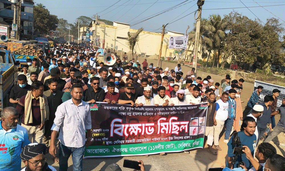 কুমিল্লা-৪ (দেবীদ্বার) আসনে জাতীয় নাগরিক পার্টির (এনসিপি) প্রার্থী হাসনাত আব্দুল্লাহর নির্বাচনী ব্যানার পোড়ানোসহ একাধিক সহিংস ঘটনার প্রতিবাদে দেবীদ্বারে বিক্ষোভ মিছিল ও প্রতিবাদ সমাবেশ করেছে ঐক্যবদ্ধ বাংলাদেশ (১১ দলীয় জোট)। একই সঙ্গে এসব ঘটনার দৃষ্টান্তমূলক শাস্তির দাবি জানানো হয়।