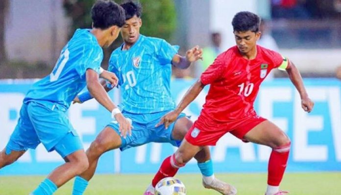 শ্রীলঙ্কার সাফ অনূর্ধ্ব-১৭ চ্যাম্পিয়নশিপে ফাইনালে বাংলাদেশ প্রথমার্ধে ২-১ গোলে পিছিয়ে ছিল। তিন মিনিটে গোল পায় ভারত। মাঝমাঠে ফ্রি-কিক আটকাতে সবাই বক্সের সামনে মানব প্রাচীর তৈরি করলেও ভারত বামপ্রান্তে থ্রো বল বাড়ায়। সেখান থেকে ক্রস বল জালে জালে জড়ায় ভারত।