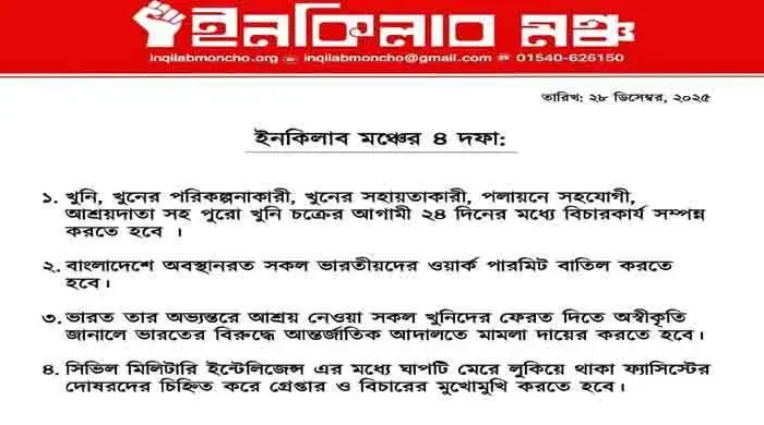 ২৪ দিনের মধ্যে হাদি হত্যার বিচারসহ ইনকিলাব মঞ্চের ৪ দাবি