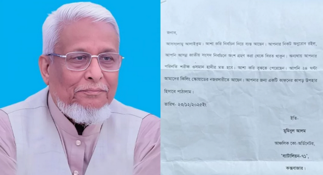 নিউজ ডেস্ক: ত্রয়োদশ জাতীয় সংসদ নির্বাচনে কক্সবাজার-৪ (উখিয়া-টেকনাফ) আসনে বিএনপির প্রার্থী শাহজাহান চৌধুরীকে নির্বাচন থেকে সরে দাঁড়াতে উড়োচিঠিতে হুমকি দেওয়া হয়েছে। চিঠির খামের ভেতরে একটি সাদা কাপড়ের টুকরোও পাওয়া গেছে,
