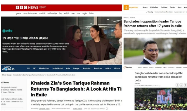 আন্তর্জাতিক ডেস্ক: দেড় যুগের প্রতীক্ষার অবসান ঘটিয়ে বৃহস্পতিবার দেশে ফিরেছেন বিএনপির ভারপ্রাপ্ত চেয়ারম্যান তারেক রহমান। তার স্বদেশ প্রত্যাবর্তন যেমন বাংলাদেশের বিভিন্ন পত্রপত্রিকায় স্থান নিয়েছে, তেমনি রয়টার্স, আল জাজিরাসহ বিভিন্ন বিদেশি