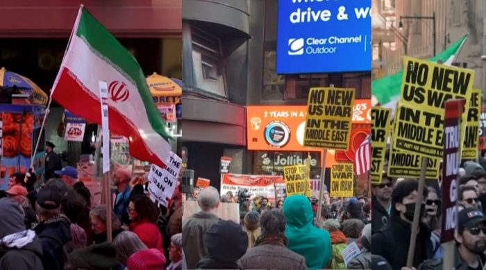 ইরানে যুক্তরাষ্ট্র ও ইসরায়েলের হামলার প্রতিবাদে উত্তাল হয়ে উঠেছে যুক্তরাষ্ট্রের নিউইয়র্ক শহর। নগরবাসীকে ইরানের পতাকা নিয়ে মিছিল করতে দেখা গেছে। এ সময় তাদের ‌‌‘নো ওয়্যার ইন মিডল ইস্ট’ লেখা প্লাকার্ড