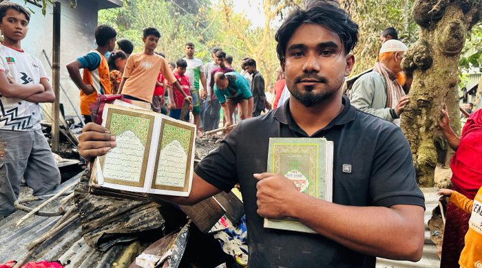 ব্রাহ্মণবাড়িয়ার নবীনগর উপজেলায় এক ভয়াবহ অগ্নিকাণ্ডের ঘটনায় বসতঘর পুড়ে ছাই হওয়ার পাশাপাশি এক শিশুর মর্মান্তিক মৃত্যু হয়েছে। তবে আগুনের লেলিহান শিখার মাঝেও পবিত্র কোরআন শরীফ অক্ষত থাকার এক ‘অলৌকিক’ ঘটনা